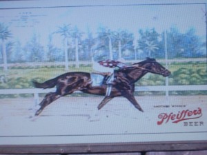 We turned off Mission Road and drove up a driveway bordered on either side by white fences and open pastures. Further on, we passed Mr. Woolf’s sprawling home and pulled up in front of the busy stables. While J.B. negotiated the sale, I went to look at Lawrin, Woolford Farm’s homegrown Kentucky Derby winner. For that amazing feat, his owners had rewarded him with a private pasture in the middle of the farm where, the big, chestnut horse with a star blaze and white front fetlocks, spent his remaining days basking in attention. I got to see him grazing near by.